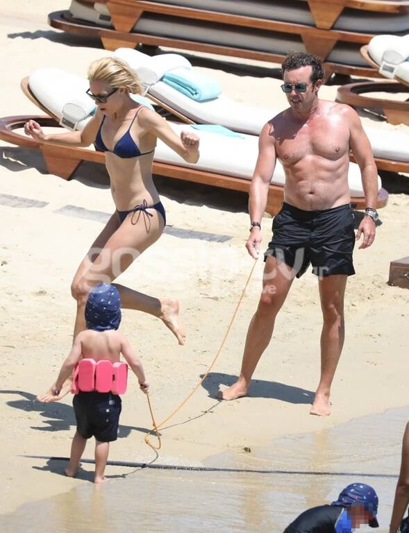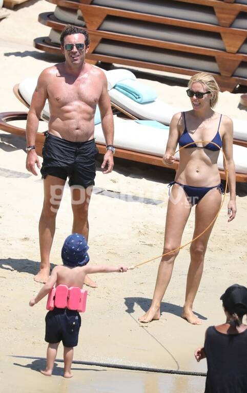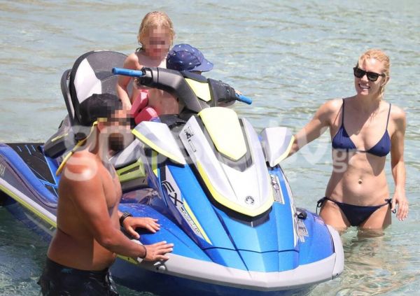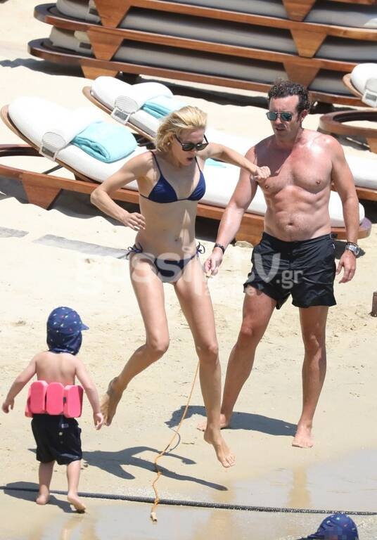 Ο φωτογραφικός φακός την εντόπισε σε ξέγνοιαστες στιγμές της σε παραλία της Μυκόνου μαζί με τον σύζυγό της Ηλία Κρασσά και τα παιδιά τους Μπιάνκα και Κάρολο.