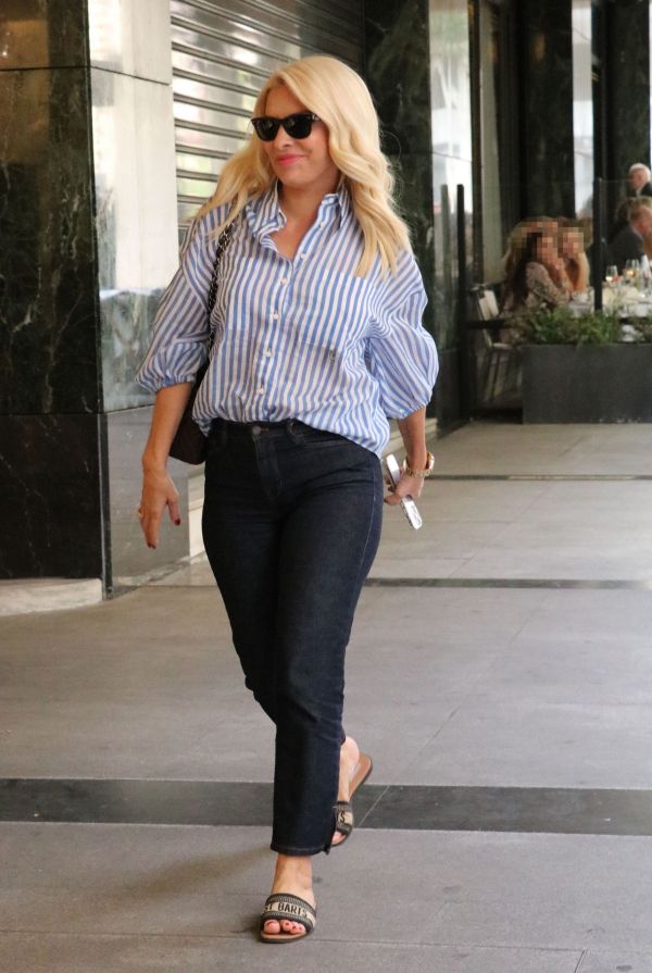 Εντυπωσιακό και το ριγέ πουκάμισο που επέλεξε για τη συγκεκριμένη εμφάνισή της.