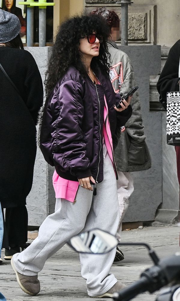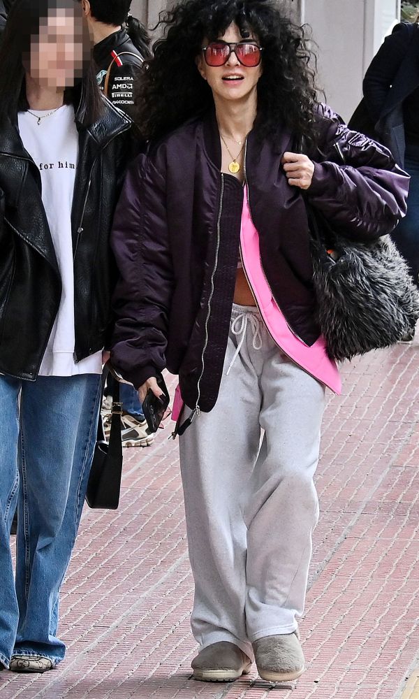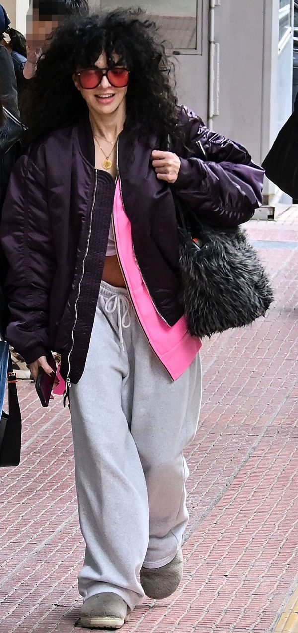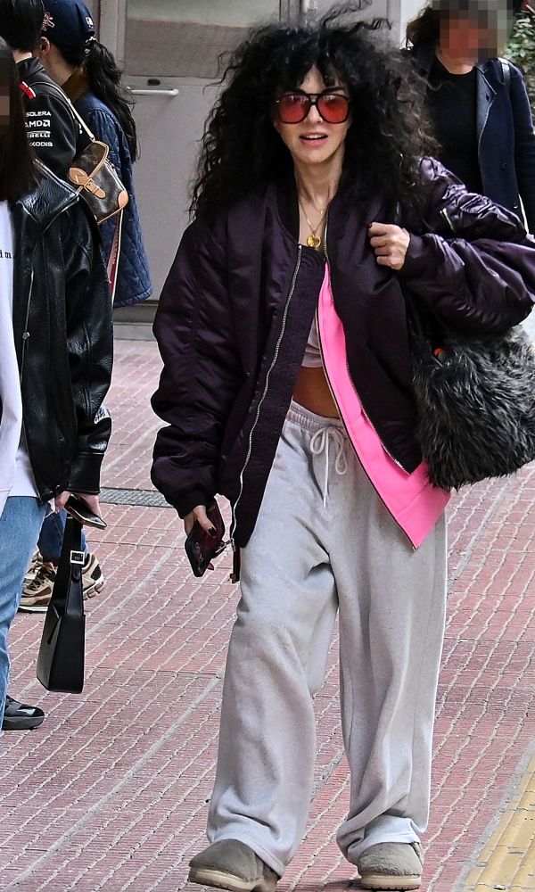 Η ηθοποιός επέλεξε ένα φαρδύ μπουφάν τύπου fly σε μεταλλική μοβ απόχρωση, το οποίο συνδύασε με wide leg γκρι φόρμα και ροζ φούτερ-τζάκετ φορεμένο ανοιχτό από μέσα. Το look της ολοκληρώθηκε με μια μεγάλη, γούνινη τσάντα, δημιουργώντας ένα σύνολο με έντονο street και fashion χαρακτήρα.