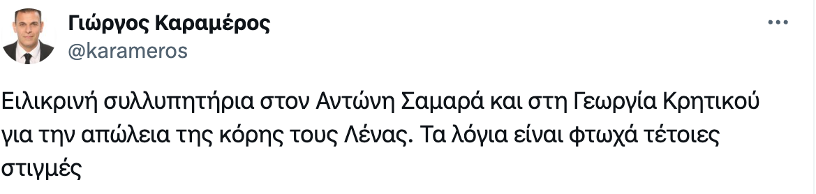 «Ολόψυχα συλλυπητήρια στον Πρόεδρο Αντώνη Σαμαρά και τη σύζυγό του Γεωργία για την τραγική απώλεια της αγαπημένης τους κόρης. Ο Θεός να τους δώσει δύναμη και κουράγιο για να αντιμετωπίσουν αυτόν τον ανείπωτο πόνο. Η σκέψη όλων μας είναι μαζί τους», έγραψε ο Νίκος Χατζηνικολάου.