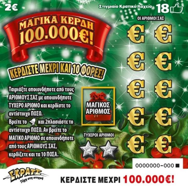 Με το χαρακτηριστικό όνομα, το εορταστικό παιχνίδι του ΣΚΡΑΤΣ αποτελεί ένα τυχερό, αλλά και οικονομικό «Δώρο Χριστουγέννων». Ειδική συσκευασία, αξίας δέκα ευρώ, περιλαμβάνει πέντε ΣΚΡΑΤΣ, από τα οποία τουλάχιστον ένα κερδίζει μέχρι και 50.000 ευρώ. Μάλιστα, η συσκευασία περιλαμβάνει ειδικό πεδίο, όπου μπορεί κανείς να γράψει μία ειδική αφιέρωση στο πνεύμα των εορτών. Τη Χριστουγεννιάτικη γκάμα του ΣΚΡΑΤΣ συμπληρώνουν δύο ακόμα παιχνίδια, τα «Μαγικά Κέρδη 100.000€!» και τα «Μαγικά Κέρδη 500.000€!», που μοιράζουν έπαθλα έως και 100.000 ευρώ και 500.000 ευρώ, αντίστοιχα.