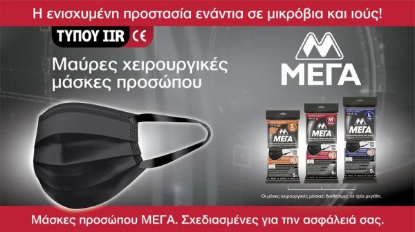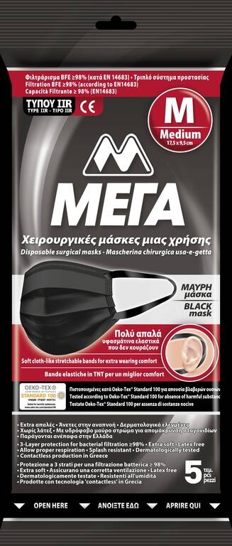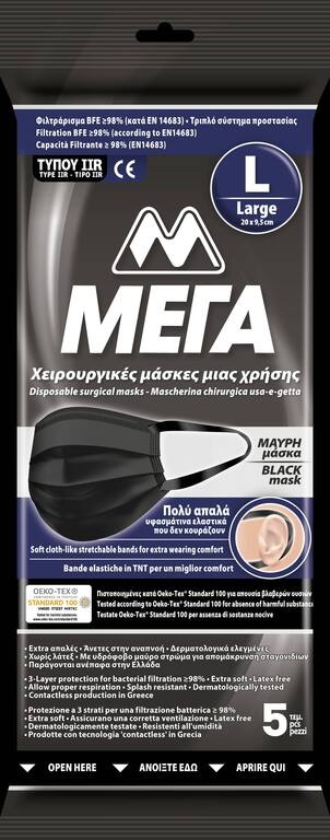 Οι νέες μαύρες χειρουργικές μάσκες προσώπου ΜΕΓΑ Type IIR, έχουν σχεδιαστεί σύμφωνα με πολύ αυστηρά κριτήρια ποιότητας προκειμένου να εξασφαλίζουν αποδεδειγμένη αποτελεσματικότητα και εξαιρετικά υψηλή προστασία.
