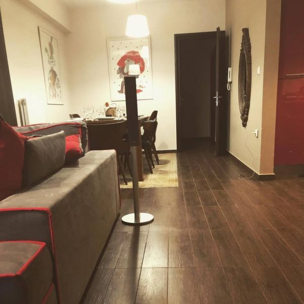 Μία κατακόκκινη μπερζέρα σε άλλο σημείο του σαλονιού αλλά και μία μικρότερη με κέντημα, αποτελούν σημείο αναφοράς στο χώρο ενώ ένας ολόκληρος τοίχος γεμάτος με πίνακες ζωγραφικής τραβάει αμέσως το βλέμμα του επισκέπτη.