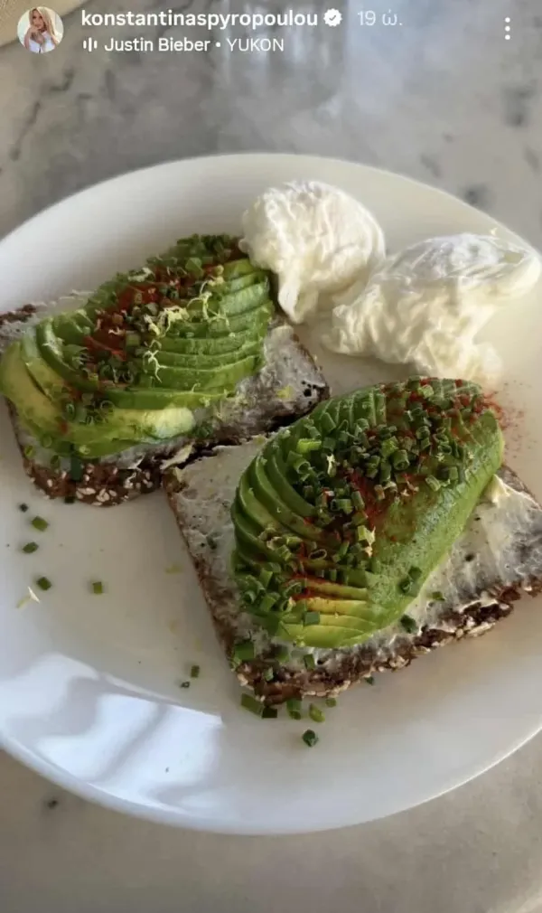 Η πρότασή της; Ένα λαχταριστό avocado toast με πολύσπορο ψωμί, απαλά αλειμμένο με τυρί κρέμα και πλούσιες φέτες αβοκάντο. Από πάνω προσθέτει σχοινόπρασο και μια πικάντικη πινελιά από πάπρικα ή μπούκοβο, που απογειώνει το αποτέλεσμα. Το πιάτο ολοκληρώνεται με ποσέ αυγά, δημιουργώντας έναν συνδυασμό γεμάτο πρωτεΐνη και καλά λιπαρά.
