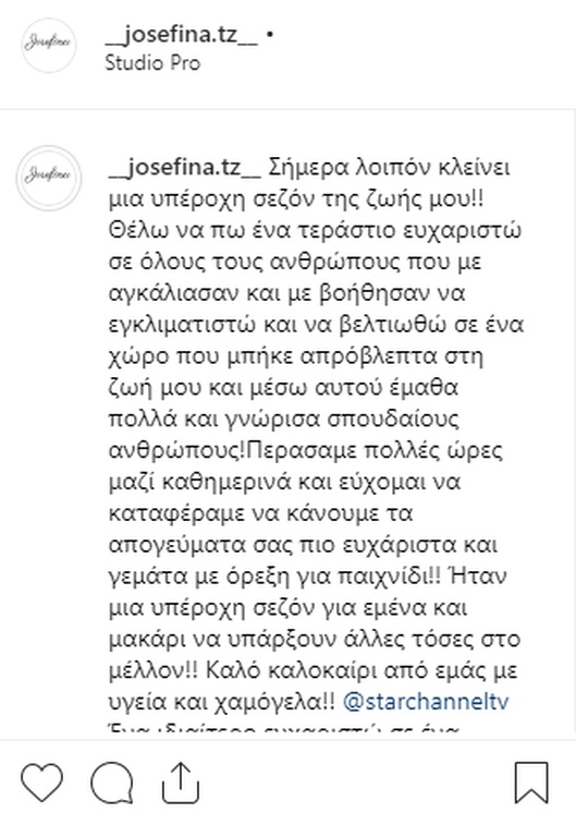 Συγκεκριμένα έγραψε μετά το τέλος της σεζόν 2018-2019: «Σήμερα λοιπόν κλείνει μια υπέροχη σεζόν της ζωής μου!!Θέλω να πω ένα τεράστιο ευχαριστώ σε όλους τους ανθρώπους που με αγκάλιασαν και με βοήθησαν να εγκλιματιστώ και να βελτιωθώ σε ένα χώρο που μπήκε απρόβλεπτα στη ζωή μου και μέσω αυτού έμαθα πολλά και γνώρισα σπουδαίους ανθρώπους! Περάσαμε πολλές ώρες μαζί καθημερινά και εύχομαι να καταφέραμε να κάνουμε τα απογεύματα σας πιο ευχάριστα και γεμάτα με όρεξη για παιχνίδι!! Ήταν μια υπέροχη σεζόν για εμένα και μακάρι να υπάρξουν άλλες τόσες στο μέλλον!! Καλό καλοκαίρι από εμάς με υγεία και χαμόγελα!! @starchanneltv Ένα ιδιαίτερο ευχαριστώ σε ένα άνθρωπο που με έκανε να νιώσω άνετα από την πρώτη στιγμή και να προσπαθώ καθημερινά να δίνω τον καλύτερο μου εαυτό για να έχουμε το καλύτερο αποτέλεσμα»!