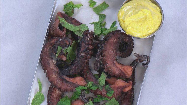 Το ορεκτικό στο σαββατιάτικο μενού, το τηγανητό χταπόδι, είναι ένας τέλειος μεζές.