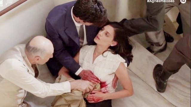 Η ηθοποιός στην αναπαράσταση βρίσκεται στο ίδιο μέρος μόνο που δεν φορά τα ρούχα εποχής και φωνάζει «Ελένη!» και δέχεται τον υποτιθέμενο πυροβολισμό, πέφτει στην αγκαλιά ενός άλλου άνδρα της σειράς, του Σπύρου Σταμούλη, που φωνάζει «Θεοδοσία!».