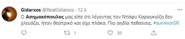 Να θυμίσουμε πως «Δεν έχετε καταλάβει πού βρίσκεται, θέλετε να καταλάβετε το θεατρικό σας, εδώ βρήκατε; Και όταν φεύγει ένας παίκτης σαν τον Ντάφυ; Σεβαστείτε ρε σεις... Είναι εδώ 6 μήνες ο άνθρωπος. Τον έχετε πετάξει στο περιθώριο, δεν του δίνατε καν να φάει, ήταν μακριά από το παιδί του και ήρθα εδώ και τον βρήκα έτσι και εκείνος μέχρι και την τελευταία στιγμή σας συγχωρούσε», είπε μεταξύ άλλων on camera ο Σάκης Κατσούλης μετά το σκηνικό με τον Ασημακόπουλο.