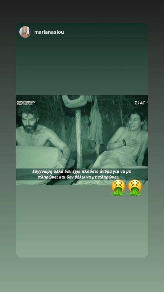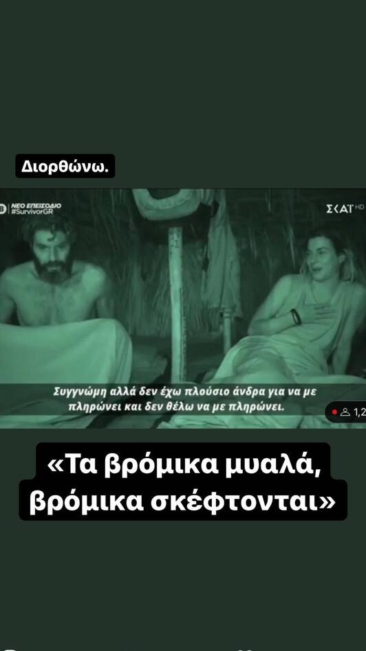 Ενώ στη συνέχεια για την ατάκα της Σταυρούλας ότι δεν έχει πλούσιο άνδρα να την πληρώνει απάντησε: «Τα βρώμικα μυαλά, βρώμικα σκέφτονται».