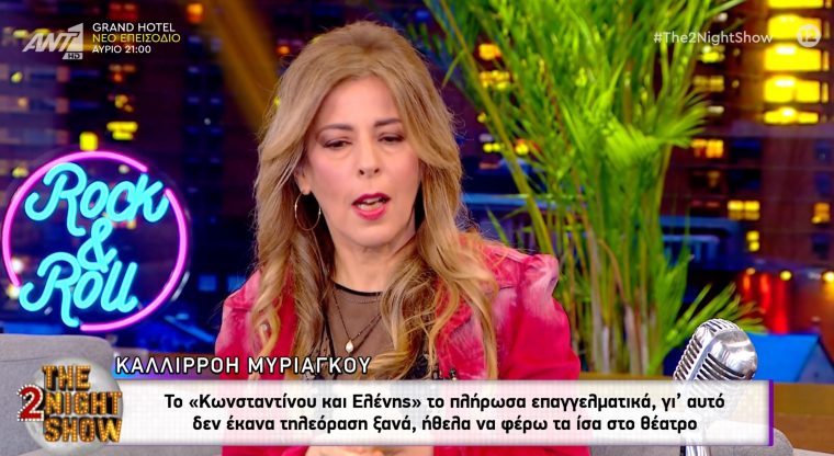 Η αγαπημένη ηθοποιός, Καλλιρρόη Μυριαγκού, που φέτος πρωταγωνιστεί στη σειρά «Άγιος Έρωτας», ήταν καλεσμένη στο The 2Night Show. Η ίδια μίλησε για τον ρόλο της, για την πολυετή πορεία της στο σανίδι, αλλά και για την επιστροφή της στην τηλεόραση μετά από πολλά χρόνια.