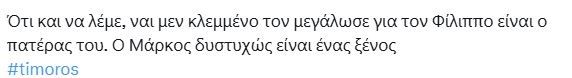 Ο Φίλιππος δεν τον άφησε. Τον πρόλαβε και τον έκανε να βρει ξανά τον εαυτό του και να σταθεί στα πόδια του. Αυτή η σκηνή ήταν μαχαίρι στην καρδιά και συγκίνησε τους τηλεθεατές που έτρεξαν να γράψουν σχόλια στο Χ.