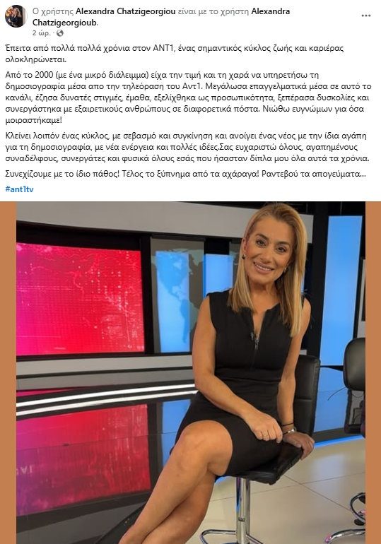 «Έπειτα από πολλά πολλά χρόνια στον ΑΝΤ1, ένας σημαντικός κύκλος ζωής και καριέρας ολοκληρώνεται. Από το 2000 (με ένα μικρό διάλειμμα) είχα την τιμή και τη χαρά να υπηρετήσω τη δημοσιογραφία μέσα από την τηλεόραση του Αντ1. Μεγάλωσα επαγγελματικά μέσα σε αυτό το κανάλι, έζησα δυνατές στιγμές, έμαθα, εξελίχθηκα ως προσωπικότητα, ξεπέρασα δυσκολίες και συνεργάστηκα με εξαιρετικούς ανθρώπους σε διαφορετικά πόστα. Νιώθω ευγνώμων για όσα μοιραστήκαμε!