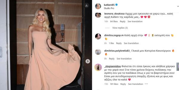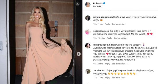 Μετά το τέλος της πρώτης εκπομπής της δημοσίευσε στιγμιότυπα με το υπέροχο φόρεμά της και... οι followers της σχολίασαν: «Αχχχχ μια εγκυούλα να χαρώ εγώ... καλή αρχή Katken της καρδιάς μας…», «Φαίνεται ότι είσαι έγκυος και αλήθεια χάρηκα με την χαρά σου! Στα τόσα χρόνια δείχνεις πολλάκις την αγάπη σου για τα παιδάκια όπως κ για τα βαφτιστήρια σου! Είσαι μια αυτοδημιούργητη ύπαρξη, έξυπνη και με φως και αξίζεις όλα τα καλά ❤️», «Καλή Αρχή Κατερίνα μου.Στη ν Εκπομπή και στην Ζωή σου!!!!!💌», «Καλή Αρχή Κατερίνα μου.Στην Εκπομπή και στην Ζωή σου!!!!!💌», «Καλή αρχή Κατερίνα. Αν είναι αλήθεια οι φήμες εγκυμοσύνης»