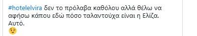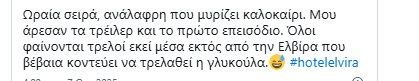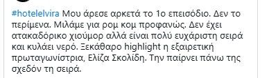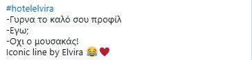 Η Ελβίρα, πασχίζοντας να αντιμετωπίσει την κατάσταση με σοβαρότητα, βρέθηκε στη δίνη ενός αλλοπρόσαλλου χάους, που όμως χάρισε στους τηλεθεατές μοναδικές στιγμές γέλιου και ατάκες που θα συζητηθούν. Και βέβαια η ηθοποιός που την υποδύεται, η Ελίζα Σκολίδη δέχτηκε διθυραμβικά σχόλια για την ερμηνεία της. Δείτε κάποια χαρακτηριστικά tweets: