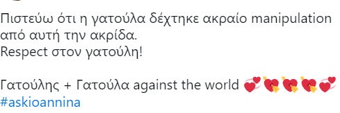 Πρόσφατα έγινε viral και ο χωρισμός τους: η «Γατούλα» έφυγε για Αθήνα και έμεινε με τον TikToker «Αφυπνιστή», ενώ ο «Γατούλης» ανέβασε βίντεο ζητώντας από τους followers να πληρώσουν για να μάθουν τις λεπτομέρειες. Το live που ακολούθησε συγκέντρωσε πάνω από 40.000 θεατές, με την «Γατούλα» να εξηγεί ότι τελικά θέλει να επιστρέψει στα Γιάννενα. Χθες ανακοίνωσαν ότι είναι ξανά μαζί.
