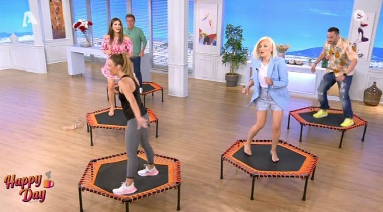 Έτσι ξεκίνησε διαφορετικά την εκπομπή της… Φορώντας ένα υπέροχο φόρεμα, ανέβηκε πάνω στο τραμπολίνο χωρίς παπούτσια και έκανε με τους συνεργάτες της γυμναστικής