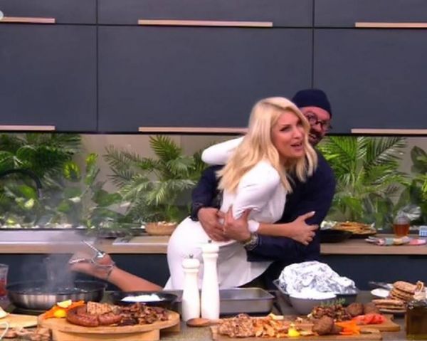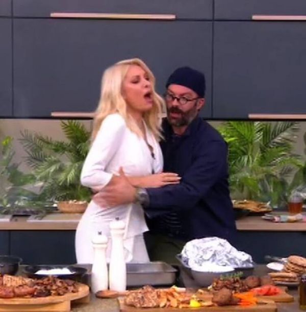Η λαμπερή παρουσιάστρια θέλησε να βοηθήσει τον σεφ Γιώργο Παπακώστα να φτιάξει πιο γρήγορα τη σπεσιαλιτέ του γιατί πεινούσε και ήθελε να δοκιμάσει. Έτσι λοιπόν την ώρα που ανακάτευε το τηγάνι και ο σεφ ήταν λίγο πιο πίσω της, δεν αντιλήφθηκε ότι η παρουσιάστρια έφευγε από τη θέση της προκειμένου να του αφήσει ελεύθερο το μέρος που ήταν η κουζίνα και… όπως γύρισε, την πάτησε και η παρουσιάστρια πόνεσε και έπεσε πάνω του!