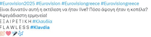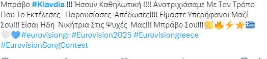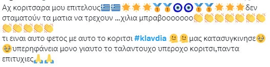 Τα hashtags #KlavdiaQueen, #FinaleGoddess και #TeamKlavdia τρεντάρουν για ώρες, ενώ ακόμα και γνωστά προφίλ με χιλιάδες ακολούθους την ανέδειξαν ως το αναμφισβήτητο highlight της βραδιάς.
