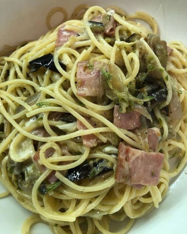 «ΣΠΑΓΓΕΤΙ ΜΕ ΚΟΛΟΚΥΘΙ , ΜΕΛΙΤΖΑΝΑ , ΚΡΕΜΜΥΔΙ , ΜΠΕΙΚΟΝ ΚΑΙ ΜΟΤΣΑΡΕΛΑ. Κόβετε το κρεμμύδι σε λωρίδες , το κολοκύθι και την μελιτζάνα σε λεπτά μπαστουνάκια. Τα σοτάρετε σε ένα βαθύ τηγάνι με ελαιόλαδό, αλάτι, πιπέρι και μυρωδικά. Μετά από λίγο αν θέλετε μπορείτε να προσθέσετε μπέικον ή αλλιώς να κάνετε Ένα vegetarian πιάτο.