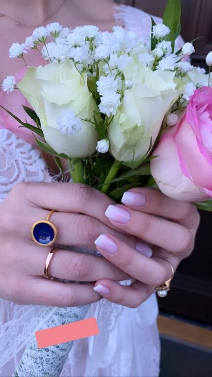 Ο γάμος έγινε κρυφά και η ίδια αρχικά δημοσίευσε μία μόνο φωτογραφία με τον άντρα της μετά το μυστήριο και σχολίασε τη φωτογραφία της γράφοντας τα εξής: «Ανοίγω τα χέρια μου που όλο τον κόσμο χώρεσαν και τώρα πια χωράνε μόνο εσένα».