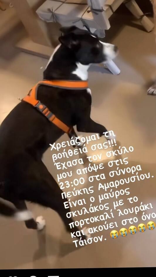 «Χρειάζομαι την βοήθειά σας. Έχασα τον σκύλο μου απόψε στις 23.00 στα σύνορα Πεύκης Αμαρουσίου. Είναι ο μαύρος σκυλάκος με το πορτοκαλί λουράκι και ακούει στο όνομα Τάισον», έγραψε χαρακτηριστικά στην ανάρτησή του ο Βασίλης Μπισμπίκης.