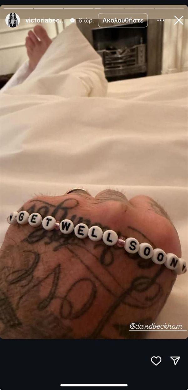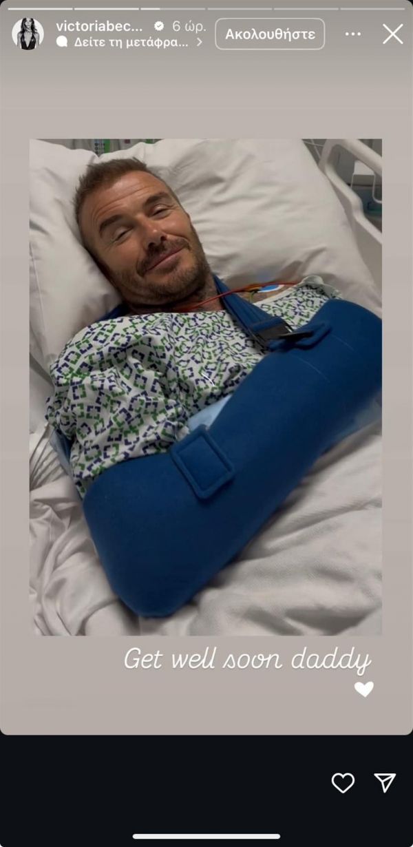 Η 51χρονη σχεδιάστρια μόδας δημοσίευσε μια φωτογραφία του πρώην άσου του ποδοσφαίρου να ποζάρει χαμογελαστός από το κρεβάτι του πόνου, φορώντας νάρθηκα στο δεξί του χέρι και η σύζυγός του έγραψε «Περαστικά, μπαμπά», ενώ στη δεύτερη φωτογραφία ο Ντέιβιντ απεικονίζεται με ένα βραχιολάκι που του έδωσαν τα παιδιά του.