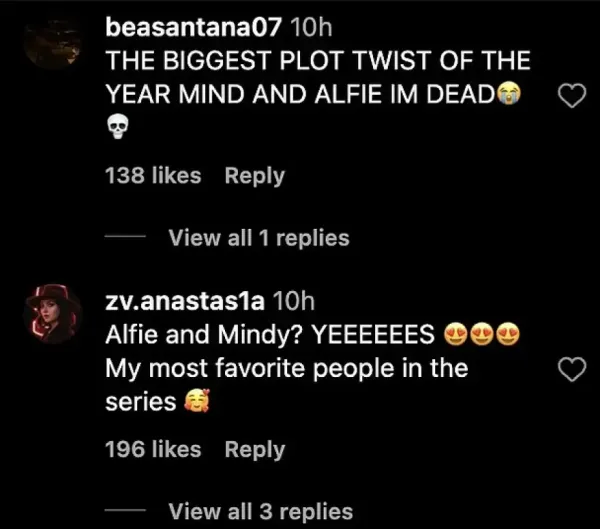 Οι αντιδράσεις των θαυμαστών στα social media ήταν έντονες. Στην ανάρτηση της Άσλεϊ Παρκ στο Instagram για την προώθηση της νέας σεζόν, κάποιος έγραψε: «Τι; Άλφι και Μίντι; Ω Θεέ μου!!». Πολλοί σχολίασαν ότι δεν ήταν «έτοιμοι» να δουν τους δύο χαρακτήρες μαζί, ενώ ένας θαυμαστής είπε ότι δεν του αρέσει η πλοκή «με τους φίλους να βγαίνουν με πρώην». Άλλος θεατής χαρακτήρισε το γεγονός ως «τη μεγαλύτερη ανατροπή της χρονιάς», την ώρα που αρκετοί χάρηκαν με την εξέλιξη.