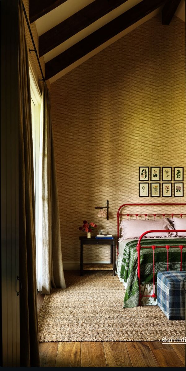 Στο υπνοδωμάτιο βλέπουμε βαριά χαλιά, ταπετσαρία και ξύλινα ταβάνια.