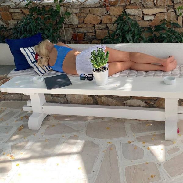 Η παρουσιάστρια απολαμβάνει τις καλοκαιρινές της διακοπές και μία ημέρα την εβδομάδα που μας πέρασε βρισκόταν στη Σχοινούσα, απ’ όπου ανέβασε μία φωτογραφίες της στην οποία απεικονιζόταν η ίδια να κοιμάται -μεσημεριανή σιέστα- λίγο μετά από ένα πλούσιο γεύμα δίπλα στη θάλασσα. Στη λεζάντα της φωτογραφίας η ίδια έγραψε: «Μετά το φαγητό! Ευτυχώς που είμαι εύκολος άνθρωπος και κοιμάμαι παντού!».