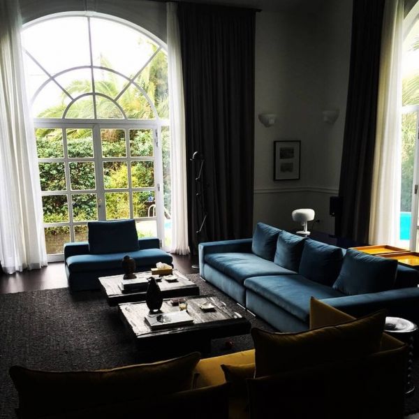 Τα χρώματα που κυριαρχούν στους τοίχους του σαλονιού του είναι το μπεζ και το γκρι, ενώ οι μπλε και κίτρινοι καναπέδες από βελούδο, συνθέτουν ένα κομψό σκηνικό. Μία λευκή τοξωτή πόρτα οδηγεί στην υπέροχη αυλή. Στο σπίτι υπάρχουν ζεστές και αγαπημένες γωνιές του καλλιτέχνη.