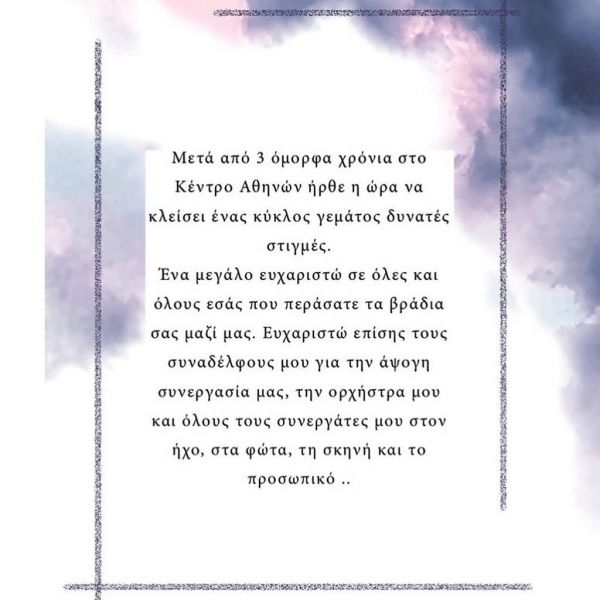 «Μετά από τρία όμορφα χρόνια στο Κέντρο Αθηνών ήρθε η ώρα να κλείσει ένας κύκλος με δυνατές στιγμές. Ένα μεγάλο ευχαριστώ σε όλους και όλες εσάς που περάσατε τα βράδια σας μαζί μας. Ευχαριστώ επίσης τους συναδέλφους μου για την άψογη συνεργασία μας, την ορχήστρα μου και όλους τους συνεργάτες μου στον ήχο, στα φώτα, τη σκηνή και το προσωπικό».