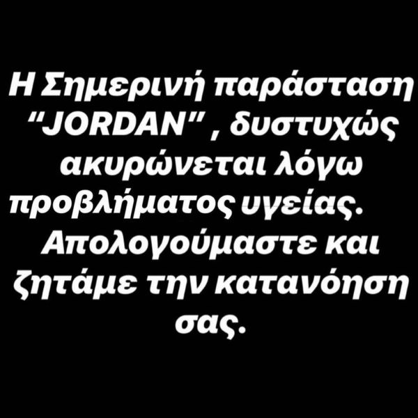 «Η σημερινή παράσταση «Τζόρνταν» δυστυχώς ακυρώνεται λόγω προβλήματος υγείας. Απολογούμαστε και ζητάμε την κατανόησή σας».
