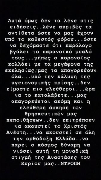 «Μας τα απαγόρευσαν όλα… Μήπως ο κορονοϊός κολλάει με τα μεγάφωνα της εκκλησίας; Απαγορεύεται ακόμα και η ελεύθερη άσκηση των θρησκευτικών μας πεποιθήσεων… Δεν επιτρέπεται να ακουστεί το Χριστός Ανέστη...να πάρει ο κόσμος δύναμη... Ντροπή τους».