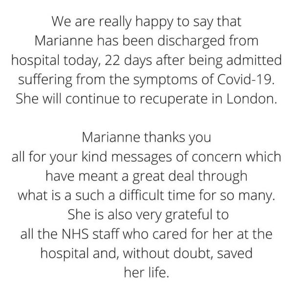 «Είμαστε στην ευχάριστη θέση να ενημερώσουμε πως πήρε εξιτήριο από το νοσοκομείο, 22 μέρες μετά τη διάγνωσή της με συμπτώματα κορονοϊού. Θα επιστρέψει σπίτι της, όπου και θα μείνει μέχρι να αναρρώσει. Σας ευχαριστεί για όλα τα μηνύματα συμπαράστασης που της έδωσαν κουράγιο αυτές τις δύσκολες ώρες. Είναι ταυτόχρονα ευγνώμων για όλο το προσωπικό του εθνικού συστήματος υγείας που της έσωσε τη ζωή» ήταν η ανακοίνωση στα social media της.
