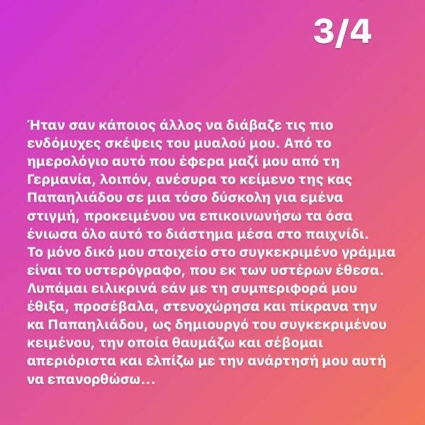Με μια ανάρτηση στον προσωπικό της λογαριασμό στο Instagram, ζήτησε συγνώμη από την συγγραφέα του κειμένου.