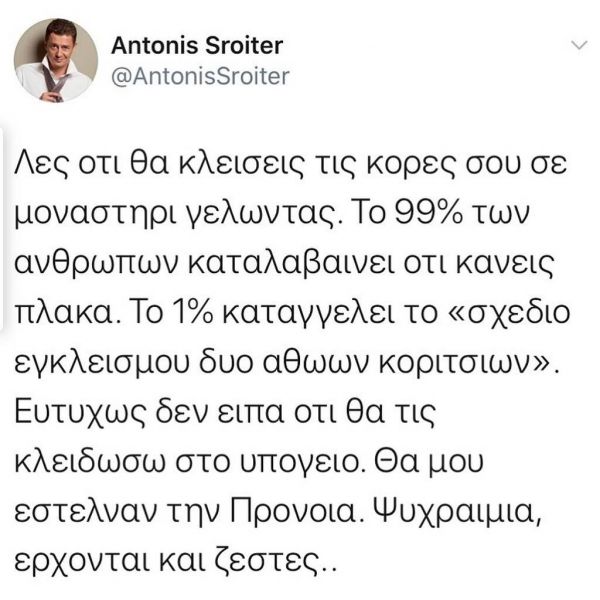 «Λες ότι θα κλείσεις τις κόρες σου σε μοναστήρι γελώντας. Το 99% των ανθρώπων καταλαβαίνει ότι κάνεις πλάκα. Το 1% καταγγέλλει το “σχέδιο εγκλεισμού δύο αθώων κοριτσιών”. Ευτυχώς δεν είπα ότι θα τις κλειδώσω στο υπόγειο. Θα μου έστελναν την Πρόνοια. Ψυχραιμία, έρχονται και ζέστες», έγραψε.