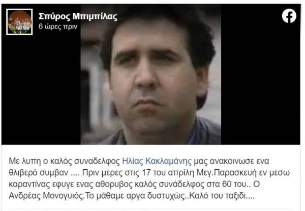 Ο Σπύρος Μπιμπίλας έγραψε χαρακτηριστικά: «Με λύπη ο καλός συνάδελφος Ηλίας Κακλαμάνης μας ανακοίνωσε ένα θλιβερό συμβάν .... Πριν μέρες στις 17 του Απρίλη Μεγάλη Παρασκευή εν μέσω καραντίνας έφυγε ένας αθόρυβος καλός συνάδελφος στα 60 του… Το μάθαμε αργά δυστυχώς.. Καλό του ταξίδι...»!