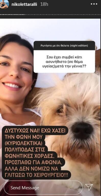 «Έχω χάσει τη φωνή μου (κυριολεκτικά). Πολύποδας στις φωνητικές χορδές. Προσπαθώ για αφωνία, αλλά δεν νομίζω να γλιτώσω το χειρουργείο».