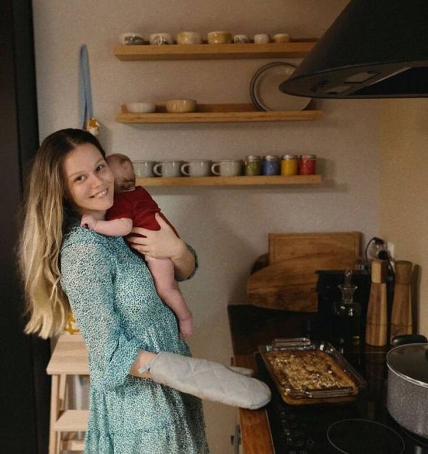 Εκείνη φτιάχνει φαγητό για να φάει με τον Γιώργο Χρανιώτη και ο τριών μηνών μπόμπιρας απολαμβάνει την αγκαλιά της μαμάς του.