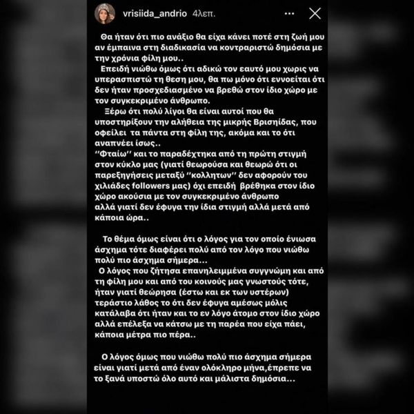 Όσο για τη Βρισηίδα Ανδριώτου, η ίδια απάντησε με τη σειρά της μέσω instagram, ξεκαθαρίζοντας τη θέση της αλλά και τους λόγους που απομακρύνθηκε από την κολλητή της.