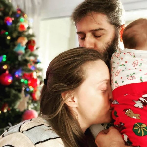 Αγκαλιά με το μωρό τους και με φόντο το δέντρο των Χριστουγέννων.