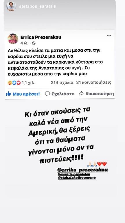 Η Έρρικα Πρεζεράκου λοιπόν ξανά ζήτησε από τους διαδικτυακούς της φίλους να προσευχηθούν μαζί της, για να αντικατασταθούν τα καρκινικά κύτταρα στον εγκέφαλο της μικρής με υγιή… Η ίδια ελπίζει σε ένα θαύμα και να γυρίσει πίσω η ανιψιά της υγιέστατη.