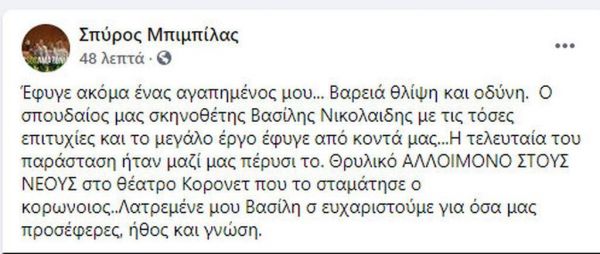 "Έφυγε ακόμα ένας αγαπημένος μου... Βαρειά θλίψη και οδύνη. Ο σπουδαίος μας σκηνοθέτης Βασίλης Νικολαΐδης με τις τόσες επιτυχίες και το μεγάλο έργο έφυγε από κοντά μας...Η τελευταία του παράσταση ήταν μαζί μας πέρυσι το. Θρυλικό ΑΛΛΟΙΜΟΝΟ ΣΤΟΥΣ ΝΕΟΥΣ στο θέατρο Κορονετ που το σταμάτησε ο κορωνοιος..Λατρεμένε μου Βασίλη σ ευχαριστούμε για όσα μας προσέφερες, ήθος και γνώση."