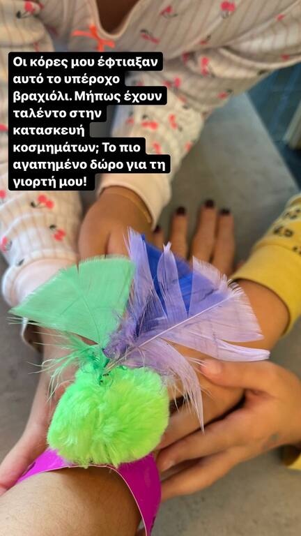 Πιο συγκεκριμένα, οι κόρες της, Νάγια και Μαίρη, της έφτιαξαν ένα χειροποίητο βραχιόλι και η περήφανη μαμά θέλησε να το μοιραστεί με τους ακολούθους στο Instagram. Η ίδια ανέβασε σχετικό Instagram story, όπου γράφει χαρακτηριστικά:
