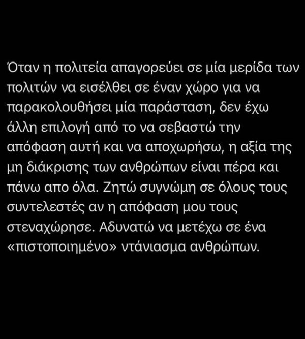 Όταν η πολιτεία απαγορεύει σε μια μερίδα των πολιτών να εισέλθει σε έναν χώρο για να παρακολουθήσει μία παράσταση, δεν έχω άλλη επιλογή από το να σεβαστώ την απόφαση και να αποχώρηση, η αξία της μη διάκρισης των ανθρώπων είναι πέρα και πάνω από όλα. Ζητώ συγγνώμη σε όλους τους συντελεστές αν η απόφαση μου τους στεναχώρησε. Αδυνατώ να μετέχω σε ένα “πιστοποιημένο” ντάνιασμα ανθρώπων. Κάθε άνθρωπος είναι μοναδικός και έχει δημιουργηθεί από τον Θεό με την ελευθερία ακόμη και να τον αρνηθεί. Δεν είμαστε αγέλη. Είμαστε άνθρωποι που αγωνιζόμαστε να φανερώσουμε το πρόσωπό μας. Ένα πρόσωπο μοναδικό, ξεχωριστό. Είμαστε μία κοινωνία προσώπων, όχι αγέλη που διαχωρίζεται σε εμβολιασμένους και μη. Εύχομαι να μας δώσει ο θεός την δύναμη να αναλάβουμε όλοι τις ευθύνες που μας αναλογούν. Καλά Χριστούγεννα», έγραψε ο ηθοποιός.