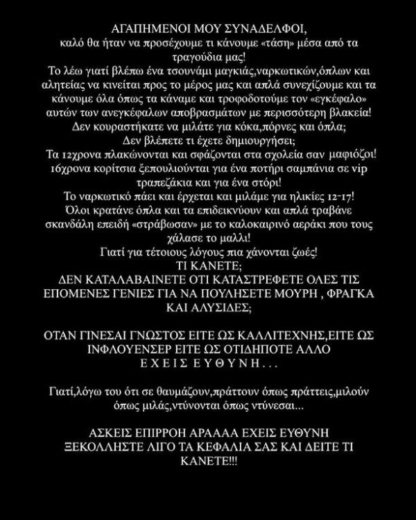 Η τραγουδίστρια έγραψε χαρακτηριστικά:«Αγαπημένοι μου συνάδελφοι, καλό θα ήταν να προσέχουμε τι κάνουμε «τάση» μέσα από τα τραγούδια μας! Τα λέω γιατί βλέπω ένα τσουνάμι μαγκιάς, ναρκωτικών, όπλων και αλητείας να κινείται προς το μέρος μας και απλά συνεχίζουμε και τα κάνουμε όλα όπως τα κάναμε και τροφοδοτούμε τον εγκέφαλο αυτών των ανεγκέφαλων αποβρασμάτων με περισσότερη βλακεία! Δεν κουραστήκατε να μιλάτε για κόκα, πόρνες και όπλα; Δεν βλέπετε τι έχετε δημιουργήσει;