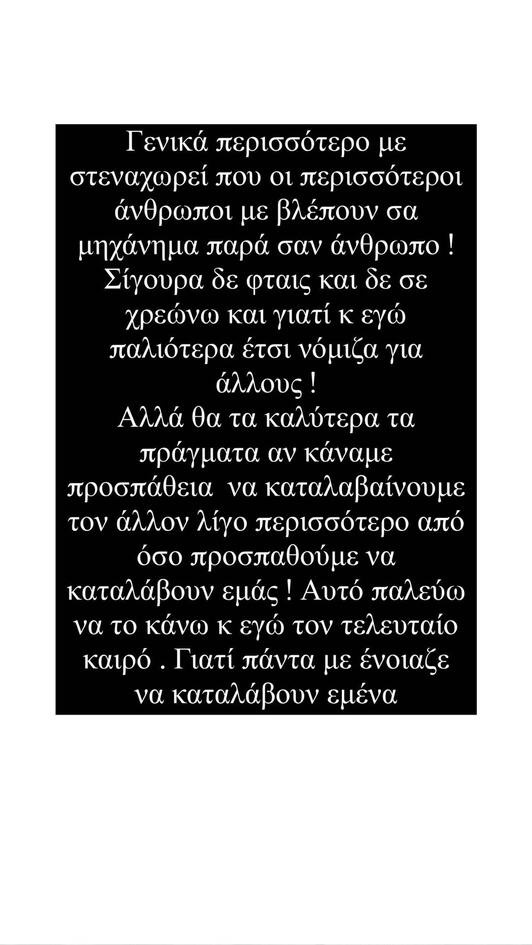 «Γενικά περισσότερο με στεναχωρεί που οι περισσότεροι άνθρωποι με βλέπουν σα μηχάνημα παρά σαν άνθρωπο. Σίγουρα δε φταις και δε σε χρεώνω γιατί και εγώ παλιότερα έτσι νόμιζα για άλλους. Αλλά θα ήταν καλύτερα τα πράγματα αν κάναμε προσπάθεια να καταλάβουμε τον άλλο λίγο περισσότερο από όσο προσπαθούμε να καταλάβουν εμάς. Αυτό παλεύω να το κάνω και εγώ τον τελευταίο καιρό γιατί πάντα με ένοιαζε να καταλάβουν εμένα».