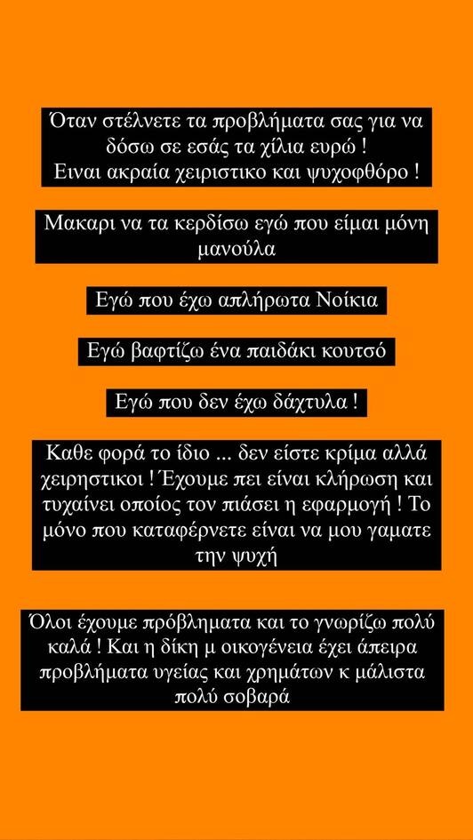 Πολύ πιο συγκεκριμένα η Super Κική έγραψε χαρακτηριστικά στις αναρτήσεις της: «Όταν στέλνετε τα προβλήματά σας για να δώσω σε εσάς τα 1000 ευρώ είναι ακραία χειριστικό και ψυχοφθόρο. “Μακάρι να τα κερδίσω εγώ που είμαι μόνο μανούλα”, “εγώ που έχω απλήρωτα νοίκια”, “εγώ βαφτίζω ένα παιδάκι κουτσό”, “εγώ που δεν έχω δάχτυλα”…