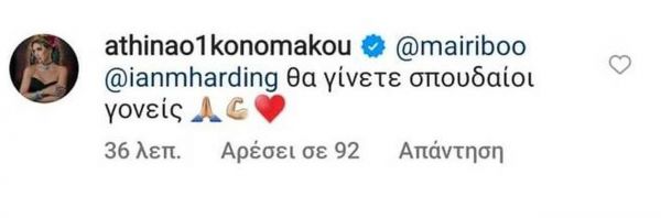 Λίγα λεπτά μετά την ανακοίνωση της εγκυμοσύνης, τα σχόλια ήταν εκατοντάδες, καθώς αμέσως οι διαδικτυακοί ακόλουθοι της influencer έσπευσαν να της ευχηθούν. Ανάμεσα σε αυτούς που ευχήθηκαν δημόσια ήταν και πρόσωπα της ελληνικής showbiz, όπως Ναταλία Γερμανού, η Κατερίνα Καινούργιου, η Κωνσταντίνα Σπυροπούλου, η Αθηνά Οικονομάκου κ.α.
