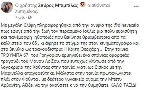 Συγκεκριμένα ο πρόεδρος του ΣΕΗ ανέφερε: «Με μεγάλη θλίψη πληροφορήθηκα από την ανιψιά της @dinavacalo πως έφυγε από την ζωή τον περασμένο Ιούλιο μια πολύ ευαίσθητη και πανέμορφη ηθοποιός που ξεκίνησε θριαμβεύτρια από τα καλλιστεία του 65 , κι άφησε το στίγμα της στον κινηματογράφο και στο βινύλιο ως τραγουδιστρια. Η Καίτη Θεοχάρη .. Στην ταινία ΤΡΟΎΜΠΑ 67 του Γρηγορίου ερμηνεύει ένα σπάνιας ομορφιάς τραγούδι του Μάνου Λοΐζου, που ευτυχώς γλύτωσε από την λογοκρισία της Χούντας στην ταινία, γιατί ως δίσκος με την Μαρινέλλα απαγορεύτηκε. Μάλιστα στην ταινία πρωταγωνιστει πλάι στον Φούντα, με δεύτερο γυναικείο όνομα την Μπετυ Αρβανίτη. Αξίζει να την ακούσετε κ να την θυμηθείτε. ΚΑΛΟ ΤΑΞΙΔΙ».
